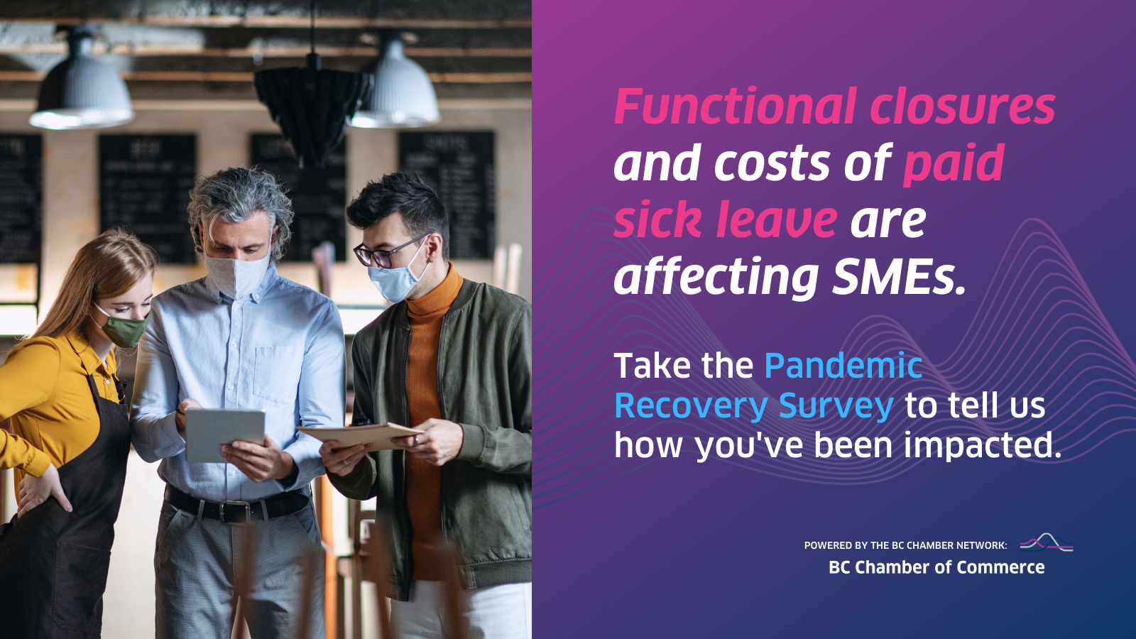 This Pandemic Recovery Survey, launched by the BC Chamber of Commerce, is the first in a quarterly series of surveys that will help us understand the actual and expected impacts of these issues on B.C. businesses and will help inform our advocacy efforts. The survey will inform our advocacy efforts and your needs and concerns will be shared directly with government.